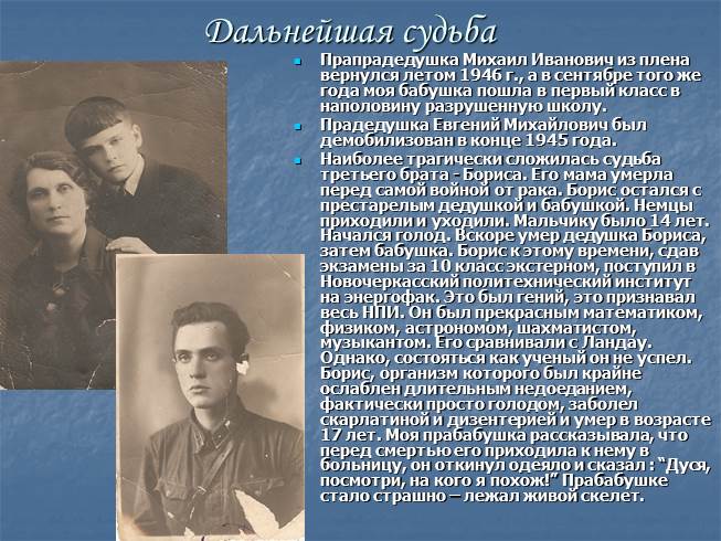 Наиболее трагически сложилась судьба третьего брата - Бориса. Его мама умерла перед самой войной от рака. Борис остался с престарелым дедушкой и бабушкой. Немцы приходили и уходили. Мальчику было 14 лет. Начался голод. Вскоре умер дедушка Бориса, затем бабушка. Борис к этому времени, сдав экзамены за 10 класс экстерном, поступил в Новочеркасский политехнический институт на энергофак. Это был гений, это признавал весь НПИ. Он был прекрасным математиком, физиком, астрономом, шахматистом, музыкантом. Его сравнивали с Ландау. Однако, состояться как ученый он не успел. Борис, организм которого был крайне ослаблен длительным недоеданием, фактически просто голодом, заболел скарлатиной и дизентерией и умер в возрасте 17 лет. Моя прабабушка рассказывала, что перед смертью его приходила к нему в больницу, он откинул одеяло и сказал : “Дуся, посмотри, на кого я похож!” Прабабушке стало страшно – лежал живой скелет.