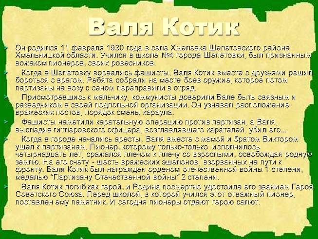 Когда в Шепетовку ворвались фашисты, Валя Котик вместе с друзьями решил бороться с врагом. Ребята собрали на месте боев оружие, которое потом партизаны на возу с сеном переправили в отряд.