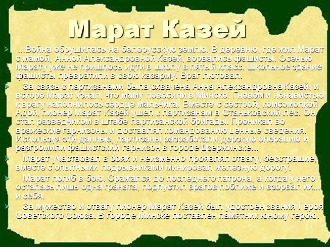 ...Война обрушилась на белорусскую землю. В деревню, где жил Марат с мамой, Анной Александровной Казей, ворвались фашисты. Осенью Марату уже не пришлось идти в школу в пятый класс. Школьное здание фашисты превратили в свою казарму. Враг лютовал.