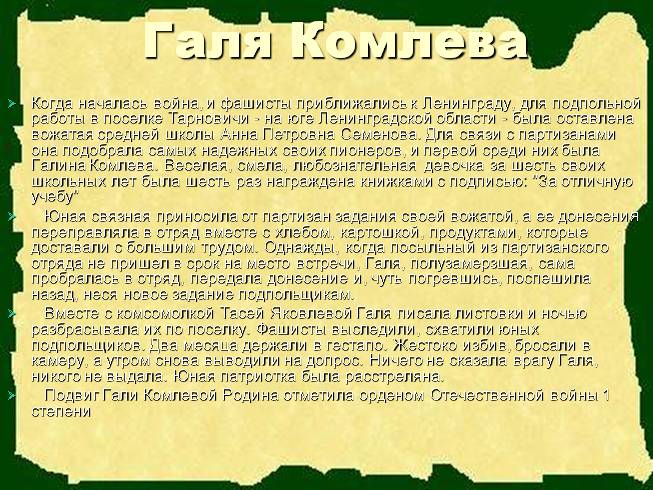 Когда началась война, и фашисты приближались к Ленинграду, для подпольной работы в поселке Тарновичи - на юге Ленинградской области - была оставлена вожатая средней школы Анна Петровна Семенова. Для связи с партизанами она подобрала самых надежных своих пионеров, и первой среди них была Галина Комлева. Веселая, смела, любознательная девочка за шесть своих школьных лет была шесть раз награждена книжками с подписью: "За отличную учебу"