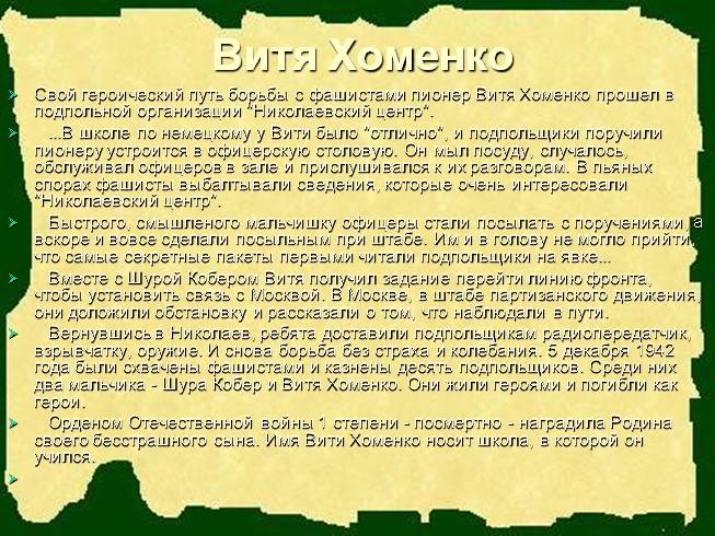 Свой героический путь борьбы с фашистами пионер Витя Хоменко прошел в подпольной организации "Николаевский центр".