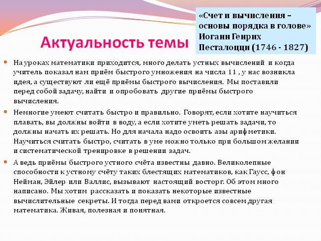 А ведь приёмы быстрого устного счёта известны давно. Великолепные способности к устному счёту таких блестящих математиков, как Гаусс, фон Нейман, Эйлер или Валлис, вызывают настоящий восторг. Об этом много написано. Мы хотим рассказать и показать некоторые известные вычислительные секреты. И тогда перед вами откроется совсем другая математика. Живая, полезная и понятная.