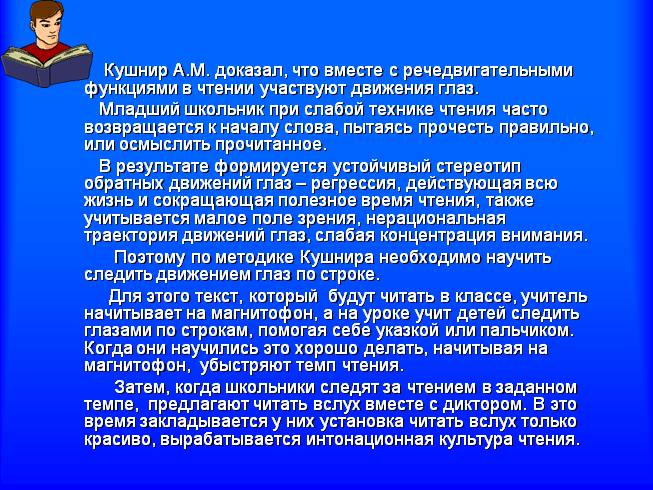 Поэтому по методике Кушнира необходимо научить следить движением глаз по строке.