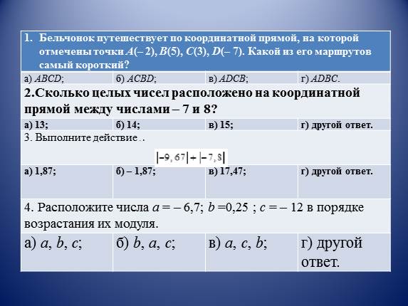 2.Сколько целых чисел расположено на координатной прямой между числами – 7 и 8? 2.Сколько целых чисел расположено на координатной прямой между числами – 7 и 8? 2.Сколько целых чисел расположено на координатной прямой между числами – 7 и 8? 2.Сколько целых чисел расположено на координатной прямой между числами – 7 и 8?
