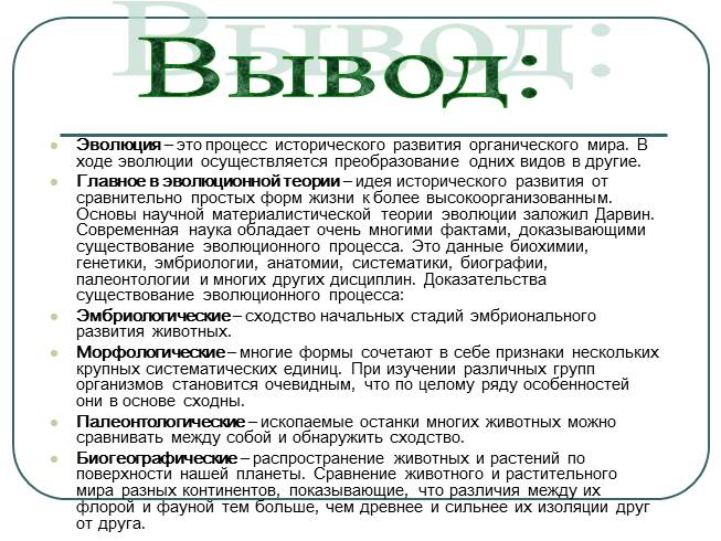 Главное в эволюционной теории – идея исторического развития от сравнительно простых форм жизни к более высокоорганизованным. Основы научной материалистической теории эволюции заложил Дарвин. Современная наука обладает очень многими фактами, доказывающими существование эволюционного процесса. Это данные биохимии, генетики, эмбриологии, анатомии, систематики, биографии, палеонтологии и многих других дисциплин. Доказательства существование эволюционного процесса: