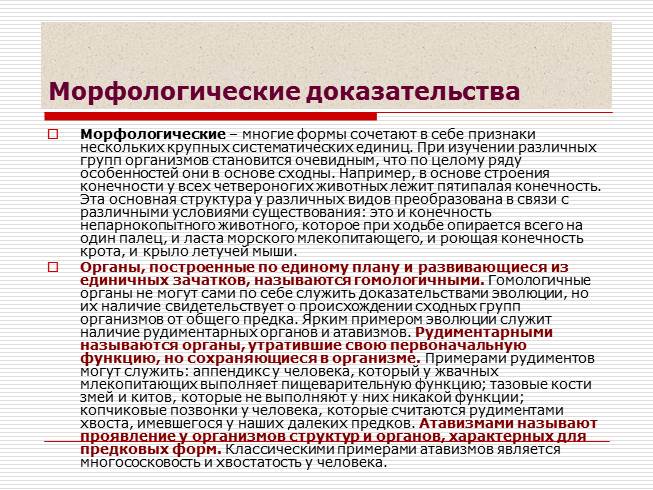 Органы, построенные по единому плану и развивающиеся из единичных зачатков, называются гомологичными. Гомологичные органы не могут сами по себе служить доказательствами эволюции, но их наличие свидетельствует о происхождении сходных групп организмов от общего предка. Ярким примером эволюции служит наличие рудиментарных органов и атавизмов. Рудиментарными называются органы, утратившие свою первоначальную функцию, но сохраняющиеся в организме. Примерами рудиментов могут служить: аппендикс у человека, который у жвачных млекопитающих выполняет пищеварительную функцию; тазовые кости змей и китов, которые не выполняют у них никакой функции; копчиковые позвонки у человека, которые считаются рудиментами хвоста, имевшегося у наших далеких предков. Атавизмами называют проявление у организмов структур и органов, характерных для предковых форм. Классическими примерами атавизмов является многососковость и хвостатость у человека.