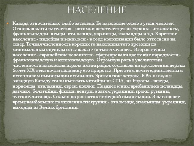Канада относительно слабо заселена. Ее население около 25 млн.человек. Основная масса населения - потомки переселенцев из Европы : англосаксы, франкоканадцы, немцы, итальянцы, украинцы, голландцы и т.д. Коренное население - индейцы и эскимосы - в ходе колонизации было оттеснено на север. Точная численность коренного населения того времени по минимальным оценкам составляла 220 тысяч человек. Вторая группа населения - европейские колонисты- сформировали две новые народности - франкоканадскую и англоканадскую. Огромную роль в увеличении численности населения играла иммиграция, составляя на протяжении первых 60 лет ХIХ века почти половину его прироста. При этом почти единственным источником иммиграции оставались Британские острова. В 80-х годах в западную Канаду стали въезжать китайцы из США, из Европы - шведы, норвежцы, итальянцы, евреи, поляки. Позднее к ним прибавились исландцы, датчане, бельгийцы, финны, венгры, а затем украинцы, греки, румыны, русские, литовцы. Сильно вырос поток немецкой иммиграции. В настоящее время наибольшие по численности группы - это немцы, итальянцы, украинцы, выходцы из Великобритании.