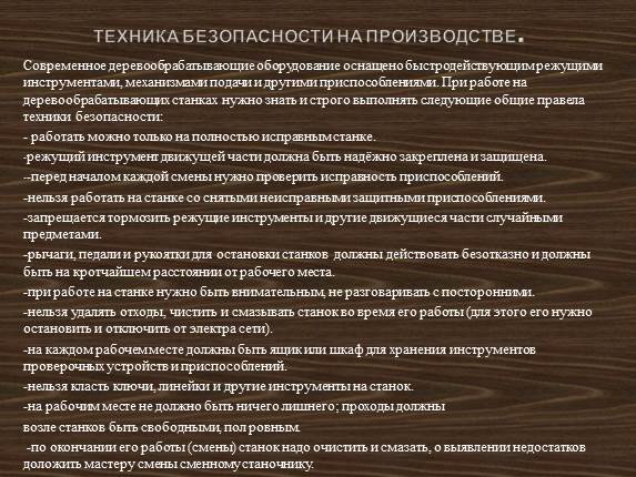 Современное деревообрабатывающие оборудование оснащено быстродействующим режущими инструментами, механизмами подачи и другими приспособлениями. При работе на деревообрабатывающих станках нужно знать и строго выполнять следующие общие правела техники безопасности: