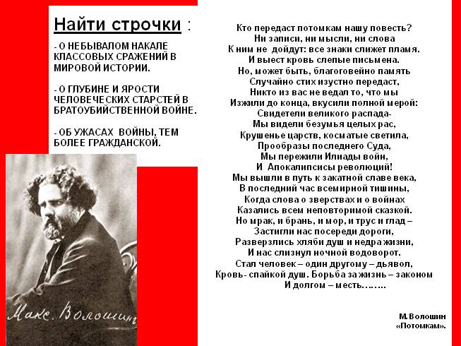 - Найти в произведениях эпизоды, иллюстрирующие красный и белый террор (красные ищут белый, белые ищут красный террор).