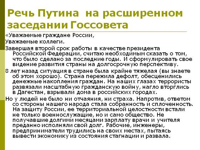 Завершая второй срок работы в качестве президента Российской Федерации, считаю необходимым сказать о том, что было сделано за последние годы. И сформулировать свое видение развития страны на долгосрочную перспективу.