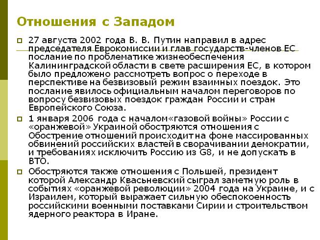 1 января 2006 года с началом«газовой войны» России с «оранжевой» Украиной обостряются отношения с Обострение отношений происходит на фоне массированных обвинений российских властей в сворачивании демократии, и требованиях исключить Россию из G8, и не допускать в ВТО.