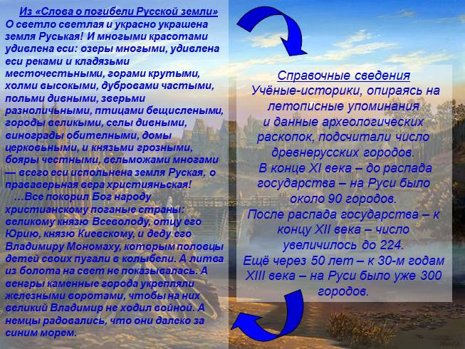 Из «Слова о погибели Русской земли» О светло светлая и украсно украшена земля Руськая! И многыми красотами удивлена еси: озеры многыми, удивлена еси реками и кладязьми месточестьными, горами крутыми, холми высокыми, дубровами частыми, польми дивными, зверьми разноличьными, птицами бещислеными, городы великыми, селы дивными, винограды обителными, домы церковьными, и князьми грозными, бояры честными, вельможами многами — всего еси испольнена земля Руская, о прававерьная вера християньская!