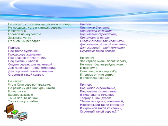 Припев. Под тихое бурчание, Процессора журчание, Под клавиш стрекотание, Под ругань и напряг Создам сервак для маленькой, Для маленькой такой компании, Для скромной такой компании Огромный такой сервак.