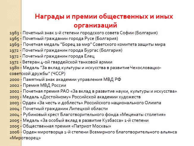 1963 - Почетный знак 1-й степени городского совета Софии (Болгария) 1965 - Почетный гражданин города Русе (Болгария) 1969 - Почетная медаль "Борец за мир" Советского комитета защиты мира 1972 - Почетный гражданин города Бургас (Болгария) 1972 - Почетный гражданин города Елец 1972 - Ветеран 4-ой гвардейской танковой армии 1980 - Медаль "За вклад культуры и искусства в развитие Чехословацко-советской дружбы" (ЧССР) 2000 - Памятный знак академии управления МВД РФ 2002 - Премия МВД России 2002 - Почетная премия РАО «За вклад в развитие науки, культуры и искусства» 2003 - Медаль «Достойному» Российской академии художеств 2003 - Орден «За честь и доблесть» Российского национального Олимпа 2004 - Почетный гражданин Липецкой области 2004 - Рубиновый крест Благотворительного фонда «Меценаты столетия» 2005 - Медаль «За особый вклад в развитие Кузбасса» 1-й степени 2005 - Общественная премия «Патриот Москвы» 2006 - Орден миротворца 1-й степени Всемирного благотворительного альянса «Миротворец»