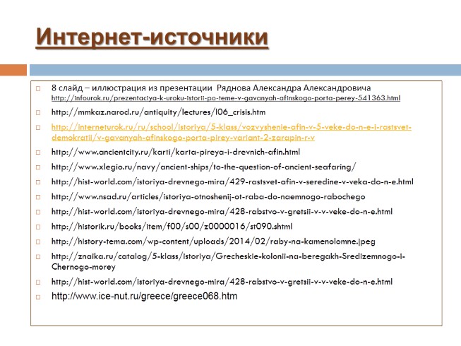 8 слайд – иллюстрация из презентации Ряднова Александра Александровича http://infourok.ru/prezentaciya-k-uroku-istorii-po-teme-v-gavanyah-afinskogo-porta-perey-541363.html