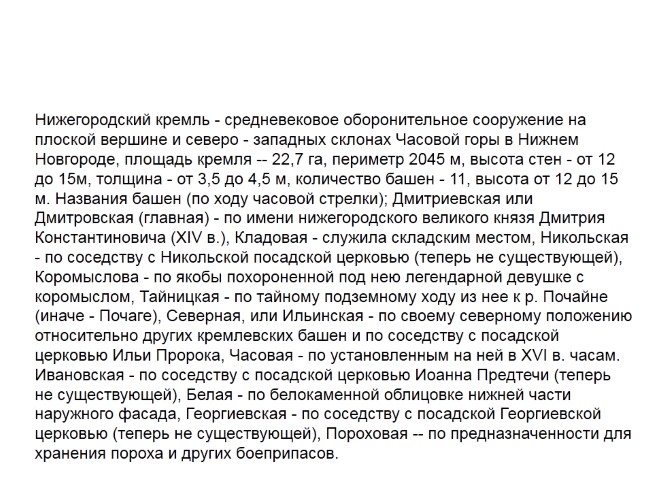 Нижегородский кремль - средневековое оборонительное сооружение на плоской вершине и cеверо - западных склонах Часовой горы в Нижнем Новгороде, площадь кремля -- 22,7 га, периметр 2045 м, высота стен - от 12 до 15м, толщина - от 3,5 до 4,5 м, количество башен - 11, высота от 12 до 15 м. Названия башен (по ходу часовой стрелки); Дмитриевская или Дмитровская (главная) - по имени нижегородского великого князя Дмитрия Константиновича (XIV в.), Кладовая - служила складским местом, Никольская - по соседству с Никольской посадской церковью (теперь не существующей), Коромыслова - по якобы похороненной под нею легендарной девушке с коромыслом, Тайницкая - по тайному подземному ходу из нее к р. Почайне (иначе - Почаге), Северная, или Ильинская - по своему северному положению относительно других кремлевских башен и по соседству с посадской церковью Ильи Пророка, Часовая - по установленным на ней в XVI в. часам. Ивановская - по соседству с посадской церковью Иоанна Предтечи (теперь не существующей), Белая - по белокаменной облицовке нижней части наружного фасада, Георгиевская - по соседству с посадской Георгиевской церковью (теперь не существующей), Пороховая -- по предназначенности для хранения пороха и других боеприпасов.