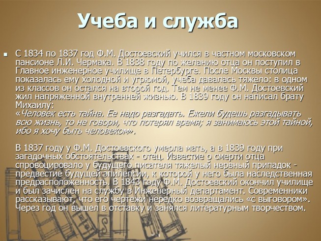 С 1834 по 1837 год Ф.М. Достоевский учился в частном московском пансионе Л.И. Чермака. В 1838 году по желанию отца он поступил в Главное инженерное училище в Петербурге. После Москвы столица показалась ему холодной и угрюмой, учеба давалась тяжело: в одном из классов он остался на второй год. Тем не менее Ф.М. Достоевский жил напряженной внутренней жизнью. В 1839 году он написал брату Михаилу: «Человек есть тайна. Ее надо разгадать. Ежели будешь разгадывать всю жизнь, то не говори, что потерял время; я занимаюсь этой тайной, ибо я хочу быть человеком». В 1837 году у Ф.М. Достоевского умерла мать, а в 1839 году при загадочных обстоятельствах - отец. Известие о смерти отца спровоцировало у будущего писателя тяжелый нервный припадок - предвестие будущей эпилепсии, к которой у него была наследственная предрасположенность. В 1843 году Ф.М. Достоевский окончил училище и был зачислен на службу в Инженерный департамент. Современники рассказывают, что его чертежи нередко возвращались «с выговором». Через год он вышел в отставку и занялся литературным творчеством.