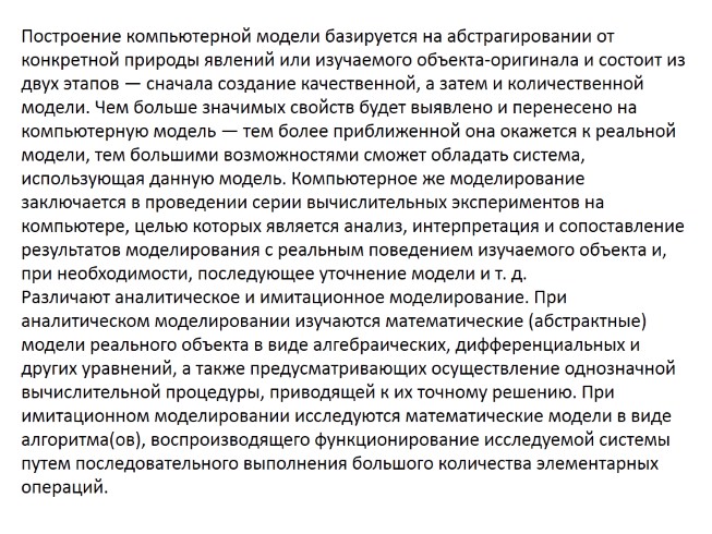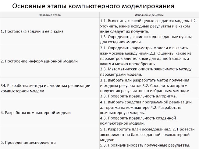 Построение компьютерной модели базируется на абстрагировании от конкретной природы явлений или изучаемого объекта-оригинала и состоит из двух этапов — сначала создание качественной, а затем и количественной модели. Чем больше значимых свойств будет выявлено и перенесено на компьютерную модель — тем более приближенной она окажется к реальной модели, тем большими возможностями сможет обладать система, использующая данную модель. Компьютерное же моделирование заключается в проведении серии вычислительных экспериментов на компьютере, целью которых является анализ, интерпретация и сопоставление результатов моделирования с реальным поведением изучаемого объекта и, при необходимости, последующее уточнение модели и т. д.