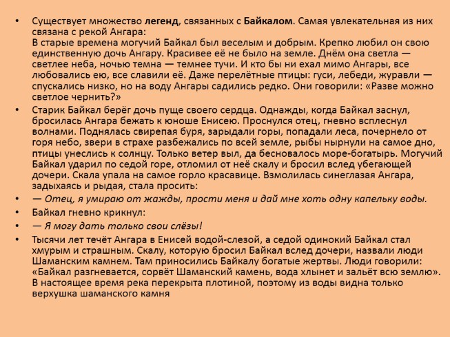 Тысячи лет течёт Ангара в Енисей водой-слезой, а седой одинокий Байкал стал хмурым и страшным. Скалу, которую бросил Байкал вслед дочери, назвали люди Шаманским камнем. Там приносились Байкалу богатые жертвы. Люди говорили: «Байкал разгневается, сорвёт Шаманский камень, вода хлынет и зальёт всю землю». В настоящее время река перекрыта плотиной, поэтому из воды видна только верхушка шаманского камня