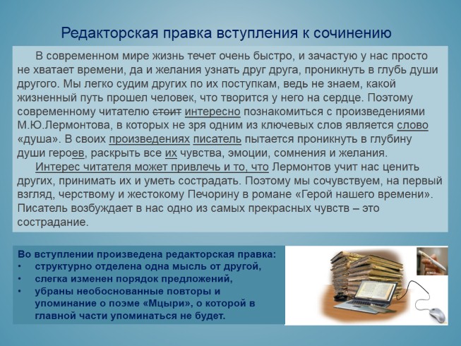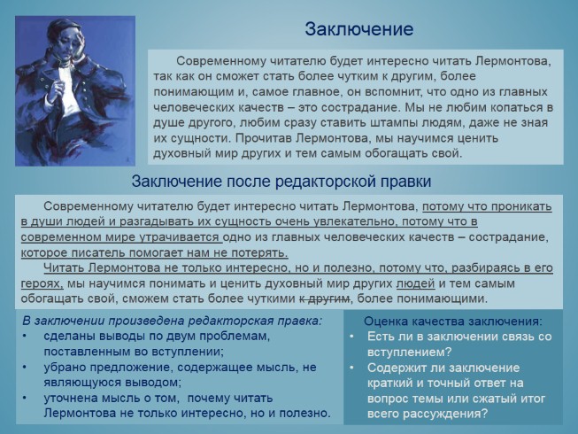 Обдумывание композиции сочинения: создание и совершенствование вступления и заключения, способы аргументации, включение в текст примеров и цитат, логические связи между частями и др.