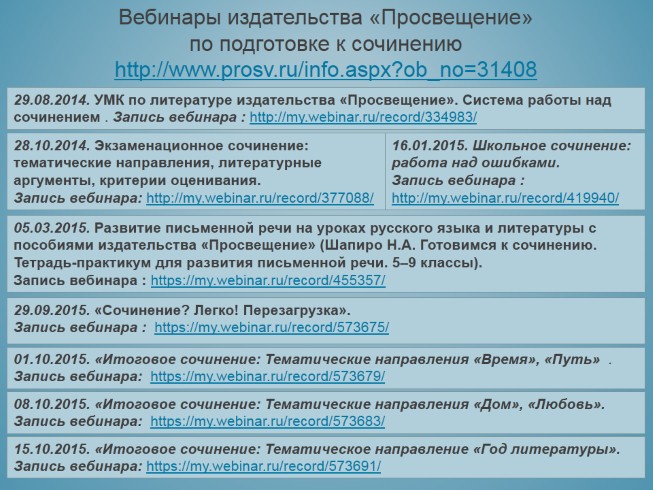 15.10.2015. «Итоговое сочинение: Тематическое направление «Год литературы». Запись вебинара: https://my.webinar.ru/record/573691/