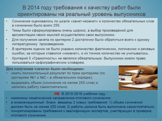 Сочинение оценивалось по шкале «зачет-незачет» и количество обязательных слов в сочинении было всего 250.