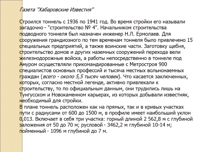 Газета "Хабаровские Известия" Строился тоннель с 1936 по 1941 год. Во время стройки его называли загадочно - "строительство № 4". Начальником строительства подводного тоннеля был назначен инженер Н.Л. Ермолаев. Для сооружения грандиозного по тем временам тоннеля было привлечено 15 специальных предприятий, а также воинские части. Заготовку щебня, строительство домов и других наземных сооружений перехода вели железнодорожные войска, а работы непосредственно в тоннеле под Амуром осуществляли прикомандированные с Метростроя 900 специалистов основных профессий и тысяча местных вольнонаемных граждан (всего - около 5,5 тысяч человек). Что касается заключенных, которых, согласно местной легенде, активно привлекали к строительству, то по официальным данным, они трудились лишь на Тунгусском и Новокаменном карьерах, из которых добывали известняк, необходимый для стройки. В плане тоннель расположен как на прямых, так и в кривых участках пути с радиусами от 600 до 1500 м, в профиле имеет наибольший уклон 0,013. Включает в себя три участка: горный длиной 2 562,8 м с глубиной заложения от 50 до 70 м; русловой - 3462,2 м глубиной 10-14 м; пойменный - 1096 м глубиной до 7 м.