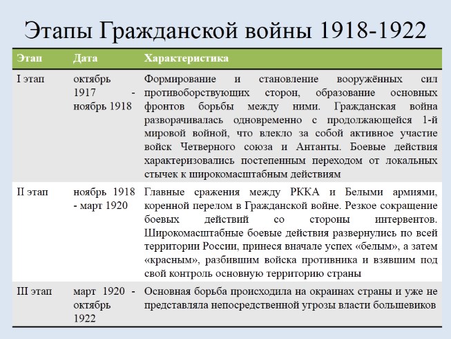 I этап октябрь 1917 - ноябрь 1918 Формирование и становление вооружённых сил противоборствующих сторон, образование основных фронтов борьбы между ними. Гражданская война разворачивалась одновременно с продолжающейся 1-й мировой войной, что влекло за собой активное участие войск Четверного союза и Антанты. Боевые действия характеризовались постепенным переходом от локальных стычек к широкомасштабным действиям