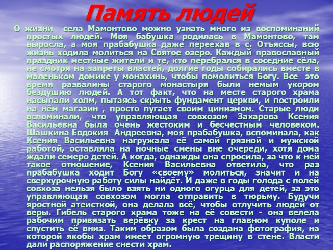О жизни села Мамонтово можно узнать много из воспоминаний простых людей. Моя бабушка родилась в Мамонтово, там выросла, а моя прабабушка даже переехав в с. Отъяссы, всю жизнь ходила молиться на Святое озеро. Каждый православный праздник местные жители и те, кто перебрался в соседние сёла, не смотря на запреты властей, долгие годы собирались вместе в маленьком домике у монахинь, чтобы помолиться Богу. Все это время развалины старого монастыря были немым укором бездушию людей. А тот факт, что на месте старого храма насыпали холм, пытаясь скрыть фундамент церкви, и построили на нём магазин , просто пугает своим цинизмом. Старые люди вспоминали, что управляющая совхозом Захарова Ксения Васильевна была очень жестоким и бесчестным человеком. Шашкина Евдокия Андреевна, моя прабабушка, вспоминала, как Ксения Васильевна нагружала её самой грязной и мужской работой, оставляла на ночные смены вне очереди, хотя дома ждали семеро детей. А когда, однажды она спросила, за что к ней такое отношение, Ксения Васильевна ответила, что раз прабабушка ходит Богу «своему» молиться, значит и на сверхурочную работу силы найдёт. И даже в годы голода с полей совхоза нельзя было взять ни одного огурца для детей, за это управляющая совхозом могла отправить в тюрьму. Будучи яростной атеисткой, она делала всё, чтобы отлучить людей от веры. Гибель старого храма тоже на её совести - она велела рабочим привязать верёвку за крест на главном куполе и спустить её вниз. Таким образом была создана фотография, на которой якобы храм имеет огромную трещину в стене. Власти дали распоряжение снести храм.