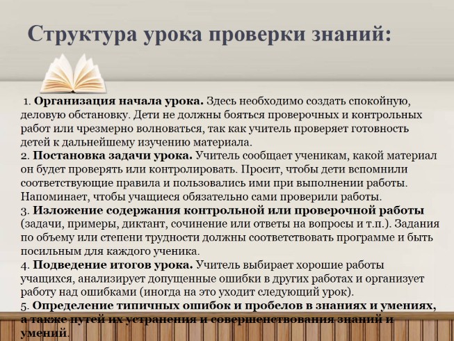 1. Организация начала урока. Здесь необходимо создать спокойную, деловую обстановку. Дети не должны бояться проверочных и контрольных работ или чрезмерно волноваться, так как учитель проверяет готовность детей к дальнейшему изучению материала. 2. Постановка задачи урока. Учитель сообщает ученикам, какой материал он будет проверять или контролировать. Просит, чтобы дети вспомнили соответствующие правила и пользовались ими при выполнении работы. Напоминает, чтобы учащиеся обязательно сами проверили работы. 3. Изложение содержания контрольной или проверочной работы (задачи, примеры, диктант, сочинение или ответы на вопросы и т.п.). Задания по объему или степени трудности должны соответствовать программе и быть посильным для каждого ученика. 4. Подведение итогов урока. Учитель выбирает хорошие работы учащихся, анализирует допущенные ошибки в других работах и организует работу над ошибками (иногда на это уходит следующий урок). 5. Определение типичных ошибок и пробелов в знаниях и умениях, а также путей их устранения и совершенствования знаний и умений.