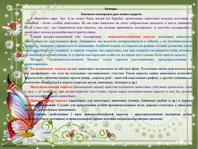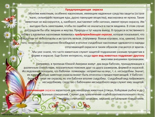 Многим животным, особенно насекомым, имеющим надежные средства защиты (острое жало, сильнодействующие яды, дурно пахнущие вещества), маскировка не нужна. Такие животные не маскируются, а, наоборот, выставляют себя напоказ, имеют яркую окраску. Им выгодно быть заметными, чтобы по ошибке не оказаться в пасти хищника. В этом случае пострадали бы оба: хищник и жертва. Природа и тут нашла выход. В процессе естественного отбора у ядовитых насекомых появилась предупреждающая окраска, которая показывает, что обладатели ее небезопасны и их трогать нельзя. (Например божьи коровки, осы, шмели). Более того, некоторые совершенно безобидные и вполне съедобные насекомые одеваются в наряды отпугивающей окраски и таким образом спасаются от врагов.