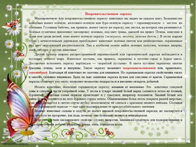 Маскировочную или покровительственную окраску животных мы видим на каждом шагу. Большинство животных имеют зеленую, желтовато-зеленую или буро-зеленую окраску – гармонирующую с местом их обитания. Гусеницы бабочек, как правило, имеют такую же окраску, как листья, на которых они развиваются. Зеленые кузнечики применяют маскировку зеленым, под цвет травы, дающей им приют. Птицы, живущие в траве или среди ветвей, тоже имеют зеленую окраску (зеленушки, пеночки, зеленые дятлы.). В лесах жарких стран с вечнозелеными деревьями преобладают животные зеленых цветов или разноцветные, окрашенные под цвет окружающей растительности. Там в изобилии можно найти зеленых попугаев, зеленых ящериц, змей, лягушек и других животных.
