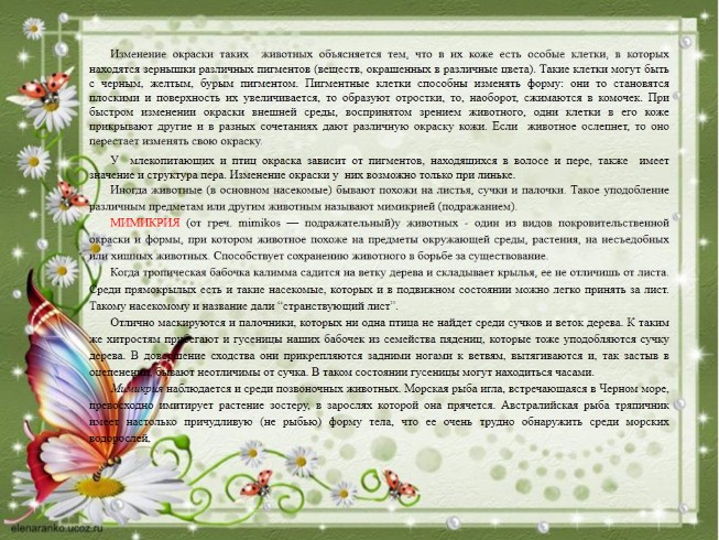 Мимикрия - полезный для животных способ маскировки, когда они становятся очень похожими на каких-либо других существ или на предметы окружающей природы. У животных мимикрия способствует сохранению в борьбе за существование. Мимикрия может быть не только направлена на пассивную защиту, но и служить орудием нападения, подманивания добычи.