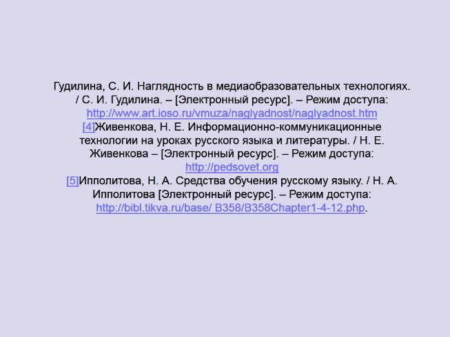 Гудилина, С. И. Наглядность в медиаобразовательных технологиях. / С. И. Гудилина. – [Электронный ресурс]. – Режим доступа: http://www.art.ioso.ru/vmuza/naglyadnost/naglyadnost.htm