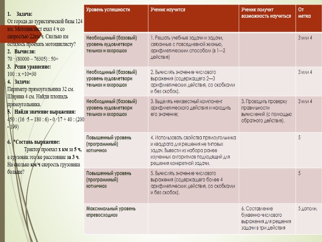 Максимальный уровень «превосходно» 6. Составление буквенно-числового выражения для решения задачи в три действия 5 дополн.