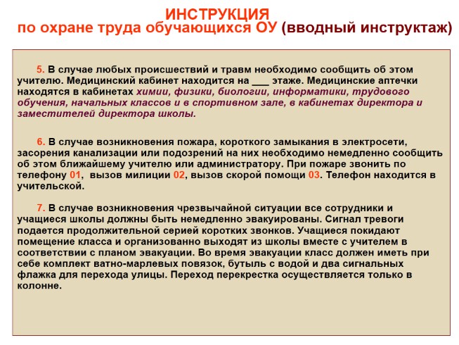 1. Кроме вводного инструктажа и инструктажа на рабочем месте, которые проводят учителя-предметники по химии, физике, ОБЖ, биологии, трудовому обучению, информатике, физкультуре, все классные руководители, воспитатели, педагоги дополнительного образования, тренеры и педагоги других категорий проводят инструктаж на рабочем месте со своими воспитанниками по, как минимум, семи направлениям: - пожарная безопасность; - электробезропасность; - правила безопасного поведения на дорогах, на транспорте, соблюдение ПДД; - соблюдение мер безопасности при проведении спортивных мероприятий, туристических походов, экскурсий, нахождении на спортплощадке; - безопасное поведение на воде, у водоема, в бассейне, на льду; - профилактика негативных криминогенных ситуаций во дворе, на улице, дома, в общественных местах; - правила поведения при нахождении взрывоопасных предметов, правил обращения со взрывоопасными предметами, веществами.