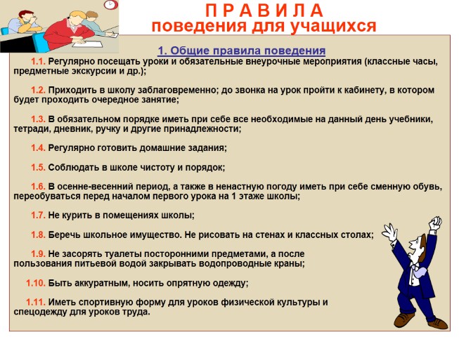 1.8. Беречь школьное имущество. Не рисовать на стенах и классных столах;