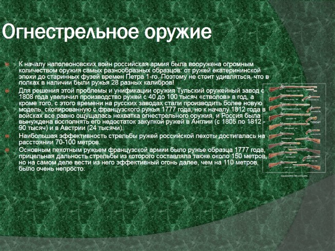 К началу наполеоновских войн российская армия была вооружена огромным количеством оружия самых разнообразных образцов: от ружей екатерининской эпохи до старинных фузей времен Петра 1-го. Поэтому не стоит удивляться, что в полках в наличии были ружья 28 разных калибров!