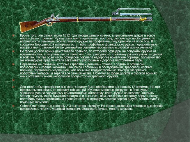 Кроме того, эти ружья эпохи 1812 года иногда давали осечки, а при сильном дожде и вовсе нельзя было стрелять. Ружья были почти идентичны, поэтому, русские при необходимости вполне могли заменить свое уставное оружие на трофейное, подобранное на поле боя. В собрании Бородинской панорамы есть такие трофейные французские ружья, переделанные под русские (с заменой белых деталей на регламентированные в русской армии желтые)