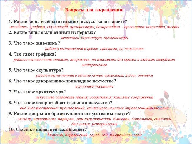 живопись, графика, скульптура, архитектура, декоративно – прикладное искусство, дизайн