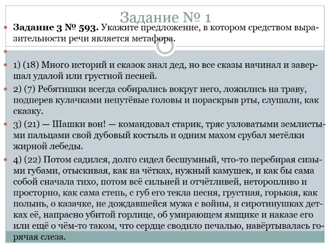 Задание 3 № 593. Укажите предложение, в котором средством выразительности речи является метафора.