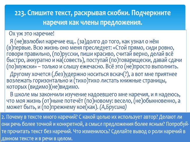 223. Спишите текст, раскрывая скобки. Подчеркните наречия как члены предложения.
