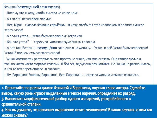 2. Прочитайте по ролям диалог Фокиной и Баранкина, опуская слова автора. Сделайте вывод, какую роль играют выделенные в тексте наречия, определите их разряд. 3. Выполните морфологический разбор одного из наречий, употреблённого в сравнительной степени. 4. Как вы думаете, что означает выражение «стать человеком»? В каких случаях, о ком так можно сказать?