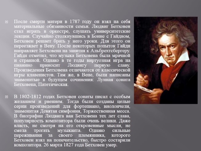 В 1802-1812 годах Бетховен сонаты писал с особым желанием и рвением. Тогда были созданы целые серии произведений для фортепиано, виолончели, знаменитая Девятая симфония, Торжественная месса. В биографии Людвига ван Бетховена тех лет слава, популярность композитора были очень велики. Даже власть, не смотря на его откровенные мысли, не смела трогать музыканта. Однако сильные переживания за своего племянника, которого Бетховен взял на попечительство, быстро состарили композитора. 26 марта 1827 года Бетховен умер.