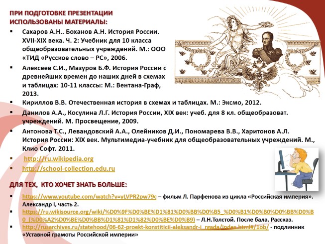 Антонова Т.С., Левандовский А.А., Олейников Д.И., Пономарева В.В., Харитонов А.Л. История России: XIX век. Мультимедиа-учебник для общеобразовательных учреждений. М., Клио Софт. 2011.