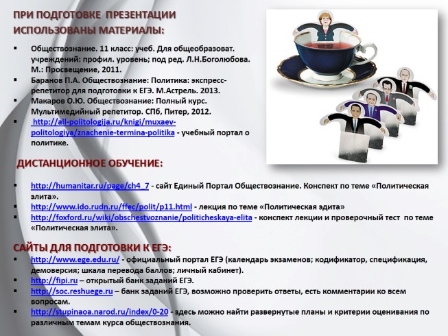 http://humanitar.ru/page/ch4_7 - сайт Единый Портал Обществознание. Конспект по теме «Политическая элита».