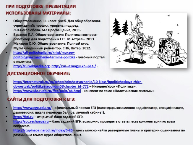http://interneturok.ru/ru/school/obshestvoznanie/10-klass/bpoliticheskaya-zhizn-obwestvab/politika?seconds=0&chapter_id=772 – ИнтернетУрок «Политика».