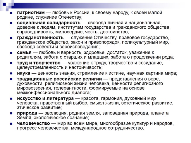 основные моральные ценности, приоритетные нравственные установки, существующие в культурных, семейных, социально-исторических, религиозных традициях многонационального народа Российской Федерации, передаваемые от поколения к поколению и обеспечивающие успешное развитие страны в современных условиях
