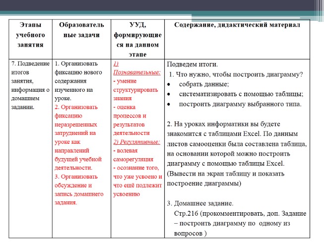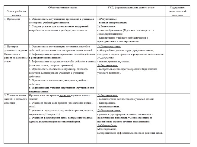 перечислены этапы урока, образовательные задачи и формируемые УУД