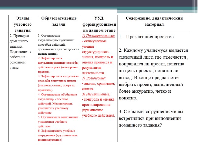 - контроль и оценка прогнозирования (при анализе учебного действия). Презентация проектов.